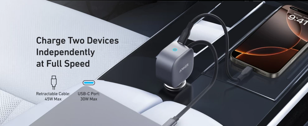 • The 45W built-in retractable cable and an additional 30W USB-C port enable you to power up two devices simultaneously at high speed.