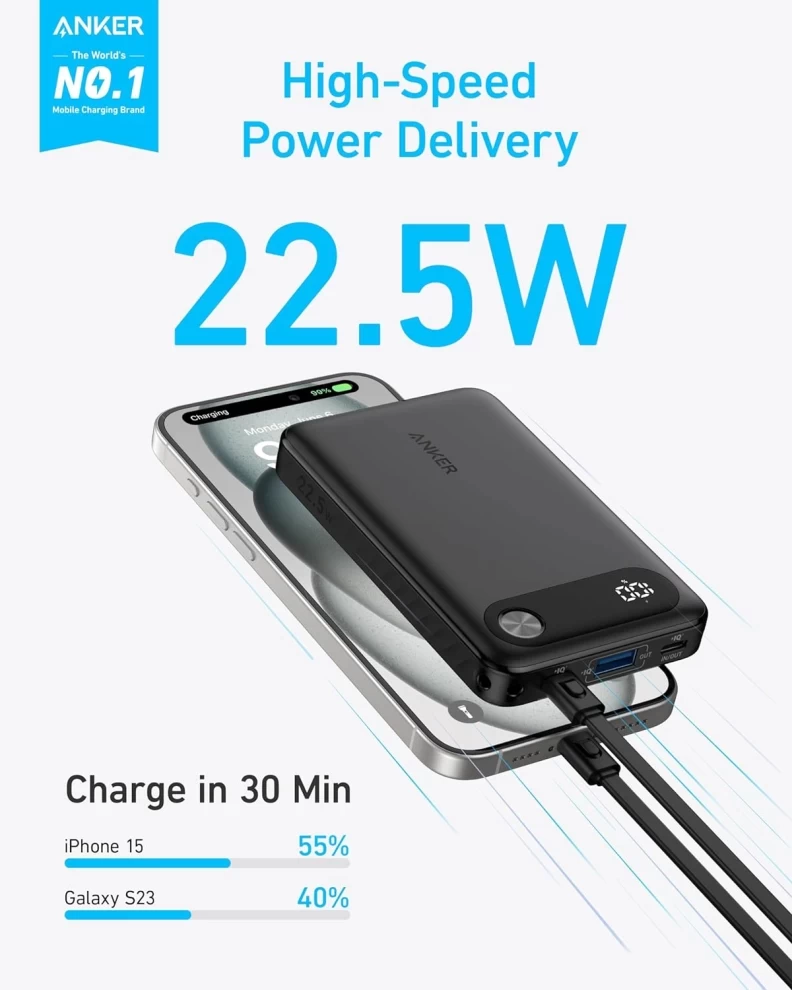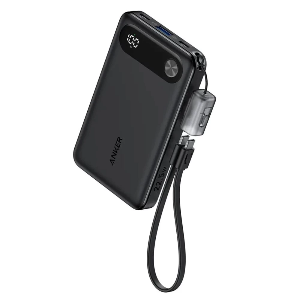 Anker Power Bank 10000mAh Portable with Built-in USB-C Cable, 22.5W Max Backup Battery, Fast Charging, LED Display.