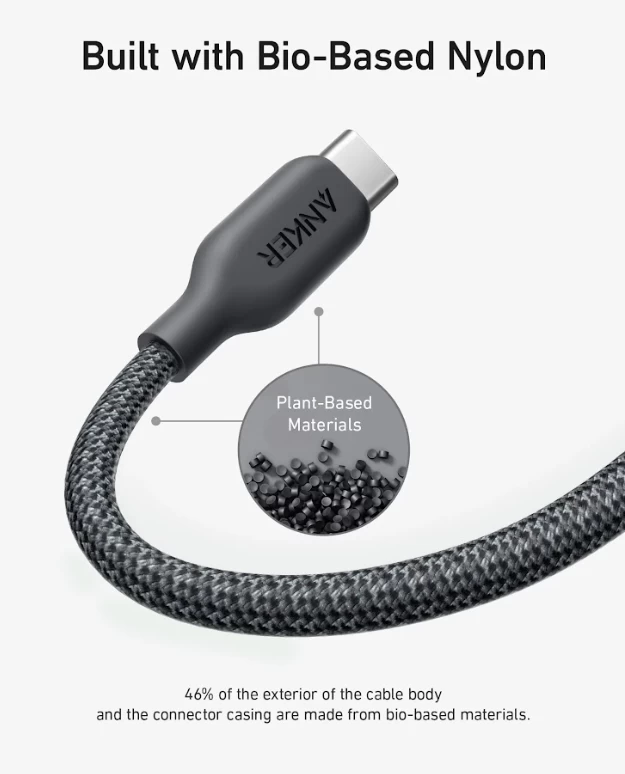 • Built with Bio-Based Nylon 46% of the exterior of the cable body and the connector casing is made from bio-based nylon.